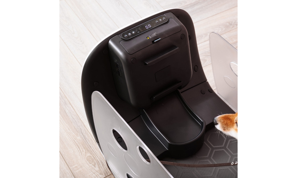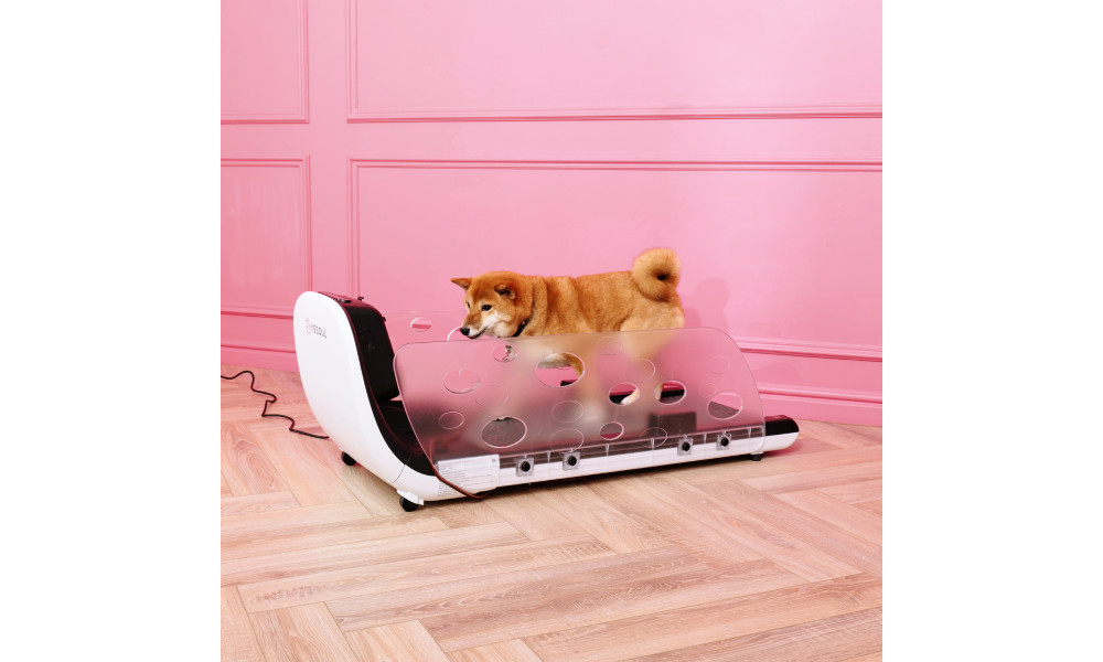 Размеры беговой дорожки составляют 121х49х44,5 см, а двигатель мощностью 100 Вт работает бесшумно, чтобы не испугать собаку. Беговое полотно имеет размеры 85х35 см и позволяет собаке двигаться со скоростью от 1 до 5 км/ч.